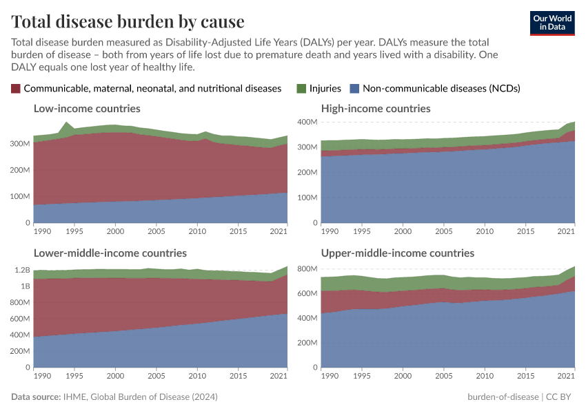 Epidemiologists break the disease burden down into three categories of disability or disease: non-communicable diseases (NCDs); communicable, maternal, neonatal, and nutritional diseases; and injuries. These are shown in the chart below.