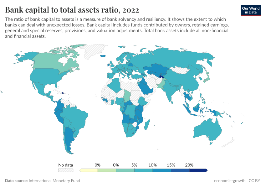 International Monetary Fund – processed by Our World in Data. “Bank capital to total assets ratio” [dataset]. International Monetary Fund, “International Monetary Fund, Financial Soundness Indicators.” [original data]. Retrieved March 18, 2025 from https://data-migration-flow-mdims.owid.pages.dev/grapher/bank-capital-to-total-assets-ratio