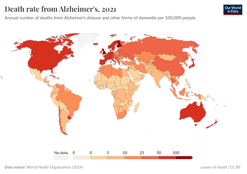 World Health Organization (2024) – with major processing by Our World in Data. “Death rate from Alzheimer's” [dataset]. World Health Organization, “Global Health Estimates” [original data]. Retrieved March 18, 2025 from https://data-migration-flow-mdims.owid.pages.dev/grapher/death-rate-from-alzheimers-other-dementias-ghe