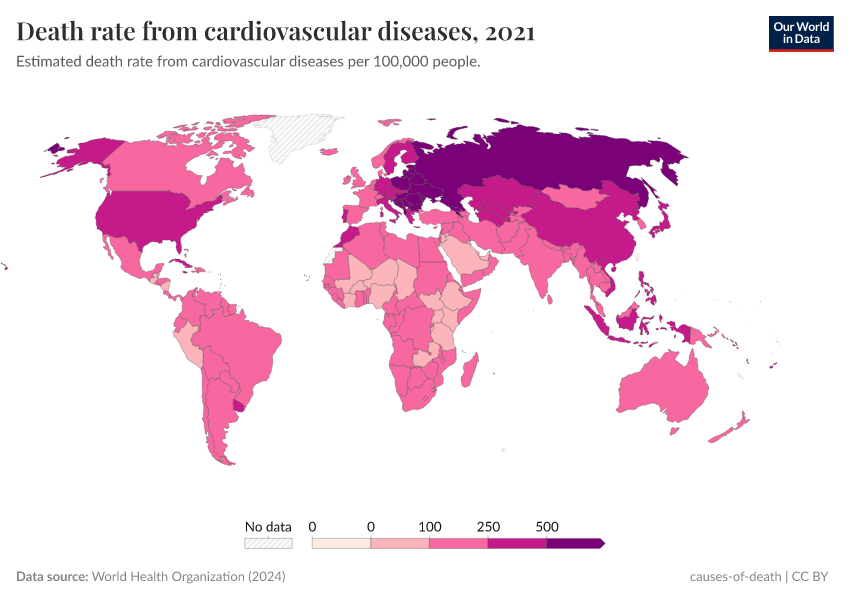 World Health Organization (2024) – with major processing by Our World in Data. “Death rate from cardiovascular diseases” [dataset]. World Health Organization, “Global Health Estimates” [original data]. Retrieved March 18, 2025 from https://data-migration-flow-mdims.owid.pages.dev/grapher/death-rate-from-cardiovascular-disease-ghe