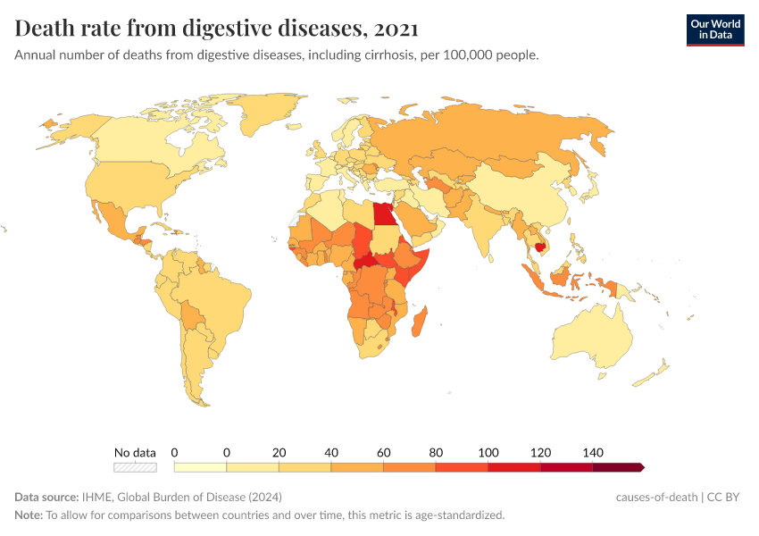 IHME, Global Burden of Disease (2024) – with minor processing by Our World in Data. “Death rate from digestive diseases” [dataset]. IHME, Global Burden of Disease, “Global Burden of Disease - Deaths and DALYs” [original data]. Retrieved March 18, 2025 from https://data-migration-flow-mdims.owid.pages.dev/grapher/death-rate-from-digestive-diseases