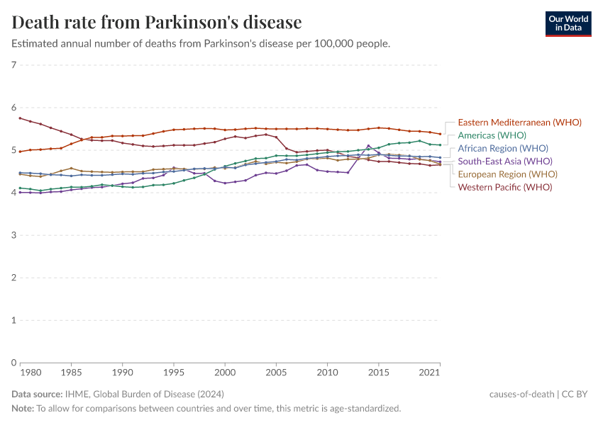 IHME, Global Burden of Disease (2024) – with minor processing by Our World in Data. “Death rate from Parkinson's disease” [dataset]. IHME, Global Burden of Disease, “Global Burden of Disease - Deaths and DALYs” [original data]. Retrieved March 18, 2025 from https://data-migration-flow-mdims.owid.pages.dev/grapher/death-rate-from-parkinsons-disease