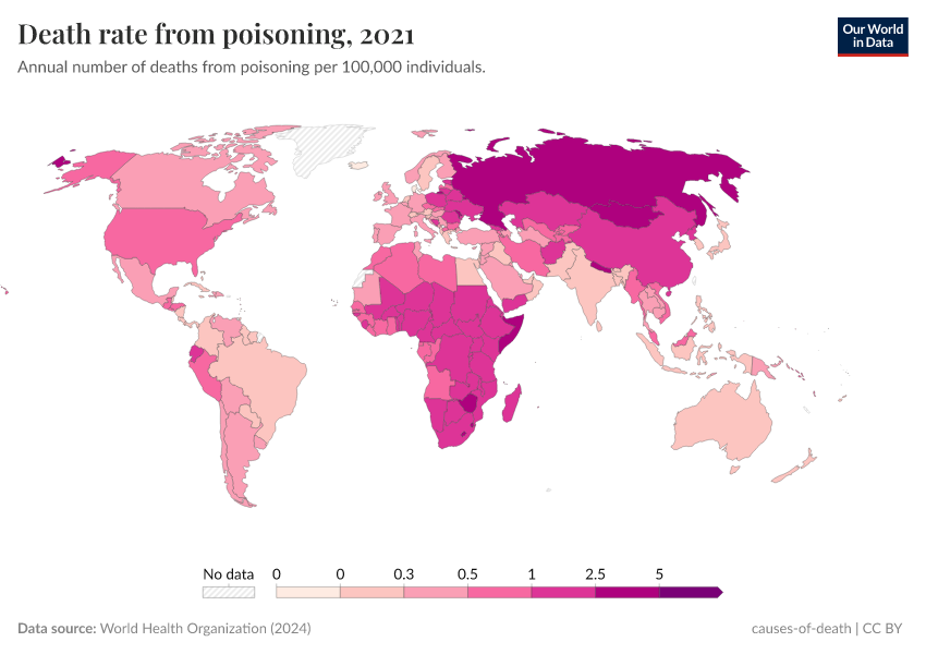World Health Organization (2024) – with major processing by Our World in Data. “Death rate from poisoning” [dataset]. World Health Organization, “Global Health Estimates” [original data]. Retrieved March 18, 2025 from https://data-migration-flow-mdims.owid.pages.dev/grapher/death-rate-from-poisoning-ghe