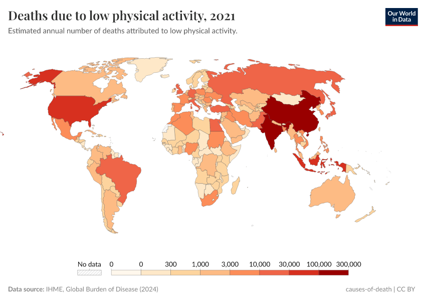 “Data Page: Deaths due to low physical activity”, part of the following publication: Esteban Ortiz-Ospina and Max Roser (2016) - “Global Health”. Data adapted from IHME, Global Burden of Disease. Retrieved from https://data-migration-flow-mdims.owid.pages.dev/grapher/deaths-due-to-low-physical-activity [online resource]How to cite this data