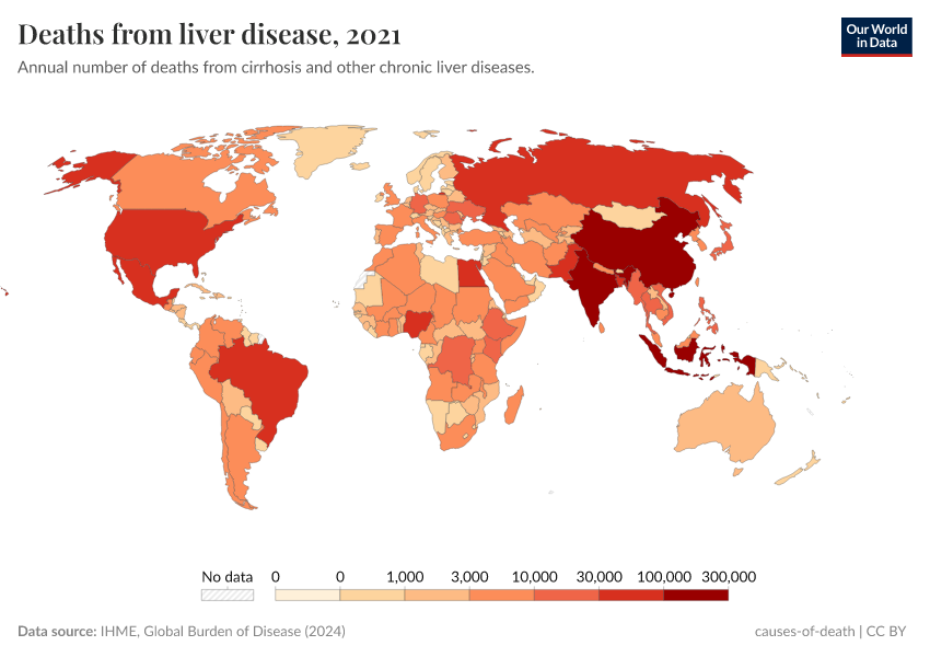 IHME, Global Burden of Disease (2024) – with minor processing by Our World in Data. “Deaths from liver disease” [dataset]. IHME, Global Burden of Disease, “Global Burden of Disease - Deaths and DALYs” [original data]. Retrieved March 18, 2025 from https://data-migration-flow-mdims.owid.pages.dev/grapher/deaths-from-liver-disease