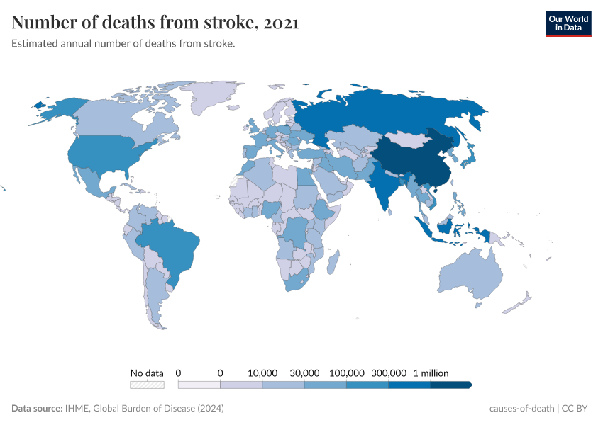IHME, Global Burden of Disease (2024) – with minor processing by Our World in Data. “Number of deaths from stroke” [dataset]. IHME, Global Burden of Disease, “Global Burden of Disease - Deaths and DALYs” [original data]. Retrieved March 18, 2025 from https://data-migration-flow-mdims.owid.pages.dev/grapher/deaths-from-strokes