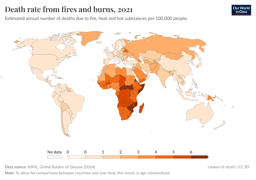 IHME, Global Burden of Disease (2024) – with minor processing by Our World in Data. “Death rate from fires and burns” [dataset]. IHME, Global Burden of Disease, “Global Burden of Disease - Deaths and DALYs” [original data]. Retrieved March 18, 2025 from https://data-migration-flow-mdims.owid.pages.dev/grapher/fire-death-rates