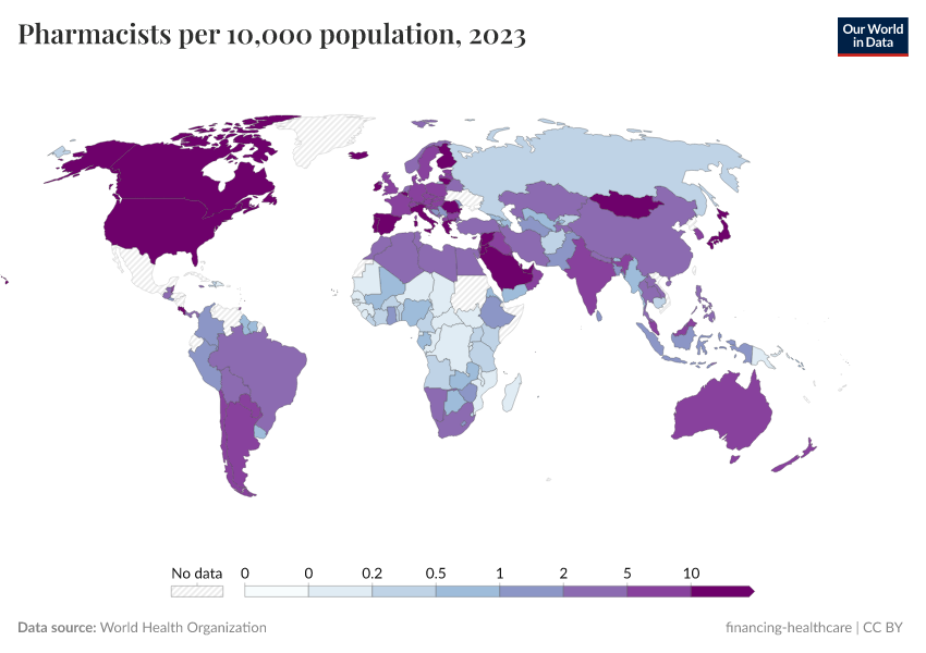 “Data Page: Pharmacists per 10,000 population”. Our World in Data (2025). Data adapted from World Health Organization. Retrieved from https://data-migration-flow-mdims.owid.pages.dev/grapher/pharmaceutical-personnel-per-1000 [online resource]How to cite this data