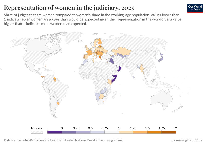 “Data Page: Representation of women in the judiciary”. Our World in Data (2025). Data adapted from Inter-Parliamentary Union. Retrieved from https://data-migration-flow-mdims.owid.pages.dev/grapher/representation-of-women-in-the-judiciary [online resource]How to cite this data