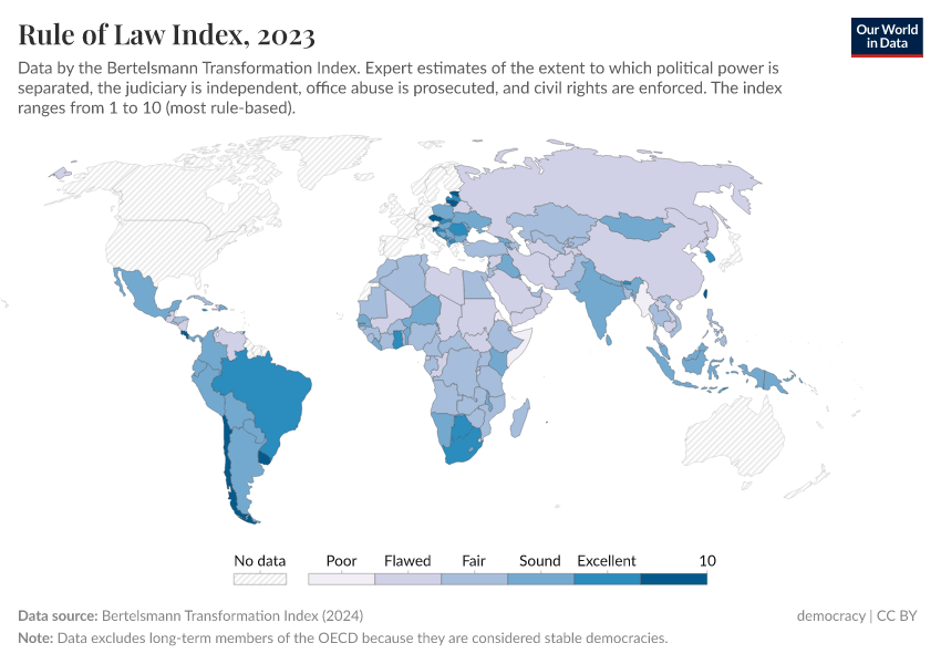 Bertelsmann Transformation Index (2024) – processed by Our World in Data. “Rule of law index” [dataset]. Bertelsmann Transformation Index, “Bertelsmann Transformation Index, Scores” [original data]. Retrieved March 18, 2025 from https://data-migration-flow-mdims.owid.pages.dev/grapher/rule-of-law-index-bti