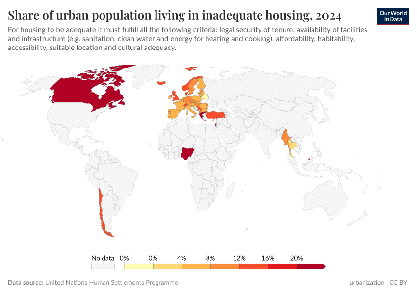 “Data Page: Share of urban population living in inadequate housing”. Our World in Data (2025). Data adapted from United Nations Human Settlements Programme. Retrieved from https://data-migration-flow-mdims.owid.pages.dev/grapher/share-of-urban-population-living-in-inadequate-housing [online resource]How to cite this data