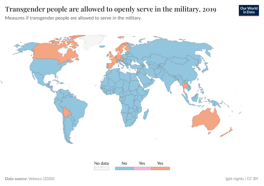 “Data Page: Transgender people are allowed to openly serve in the military”, part of the following publication: Bastian Herre and Pablo Arriagada (2023) - “LGBT+ Rights”. Data adapted from Velasco. Retrieved from https://data-migration-flow-mdims.owid.pages.dev/grapher/transgender-military [online resource]How to cite this data