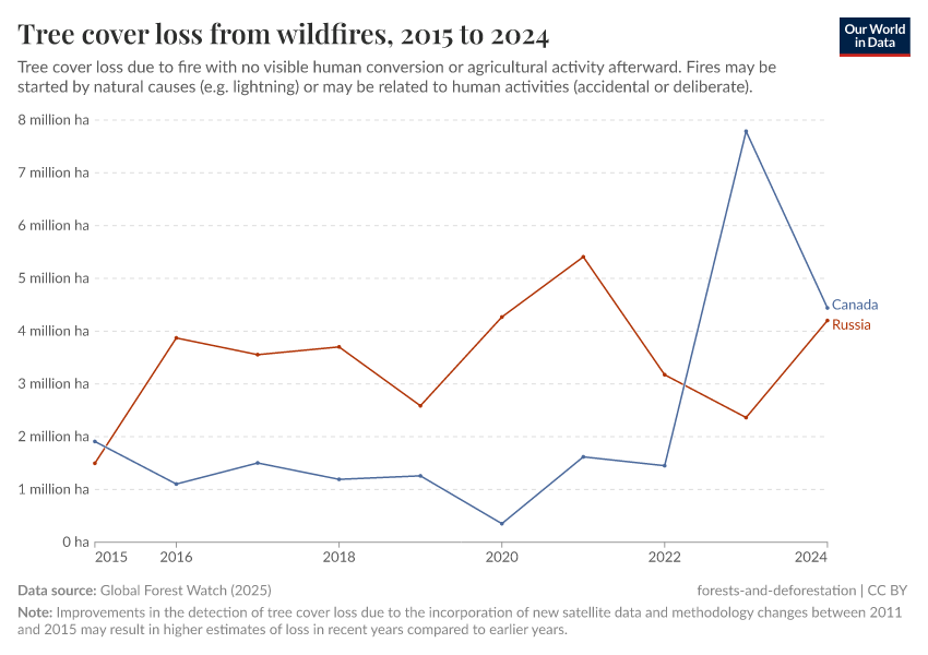 Global Forest Watch (2024) – with major processing by Our World in Data. “Tree cover loss from wildfires” [dataset]. Global Forest Watch, “Tree Cover Loss by Dominant Driver” [original data]. Retrieved March 18, 2025 from https://data-migration-flow-mdims.owid.pages.dev/grapher/tree-cover-loss-from-wildfires