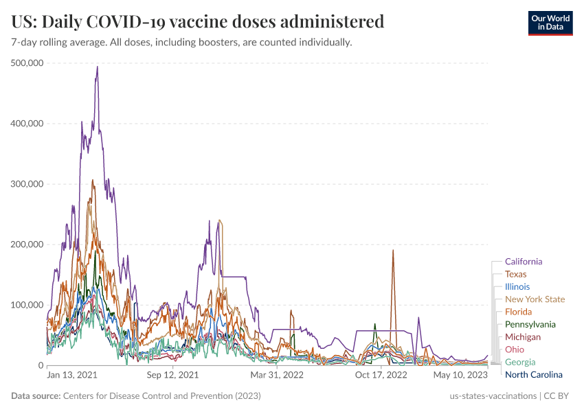 Centers for Disease Control and Prevention (2023) – processed by Our World in Data. “US: Daily COVID-19 vaccine doses administered” [dataset]. Centers for Disease Control and Prevention, “COVID-19, Vaccinations (United States)” [original data]. Retrieved March 18, 2025 from https://data-migration-flow-mdims.owid.pages.dev/grapher/us-daily-covid-vaccine-doses-administered