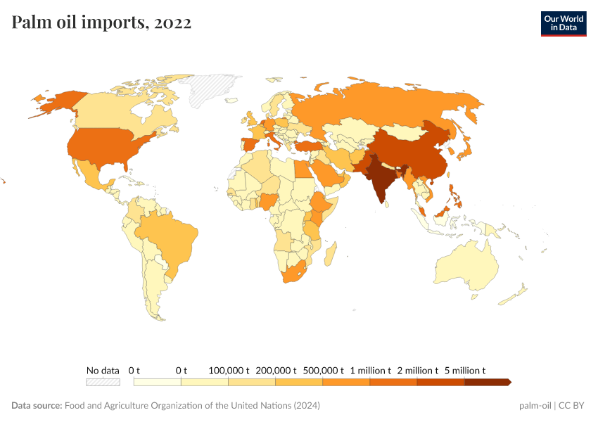 In the next section, we will look at what countries produce palm oil, but here, we see a map of palm oil imports. Although production is focused in only a few countries across the tropical belt, we see that palm oil is an important product across the world.