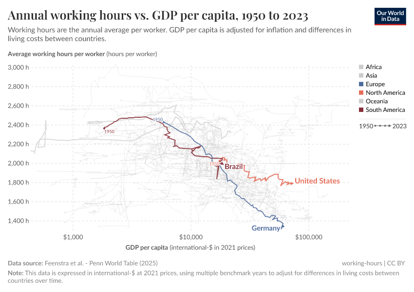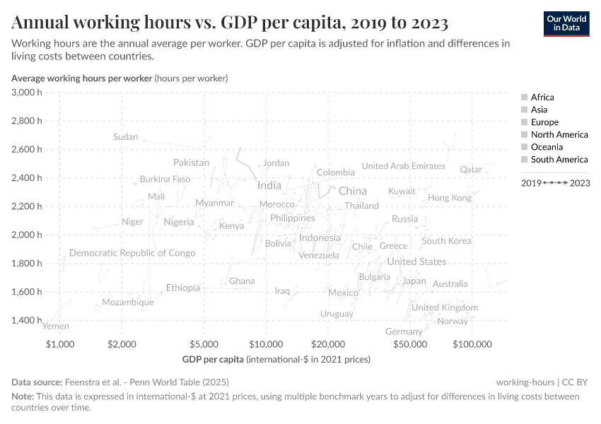 We see that in the chart here, with GDP per capita on the horizontal axis and annual working hours per worker on the vertical axis.