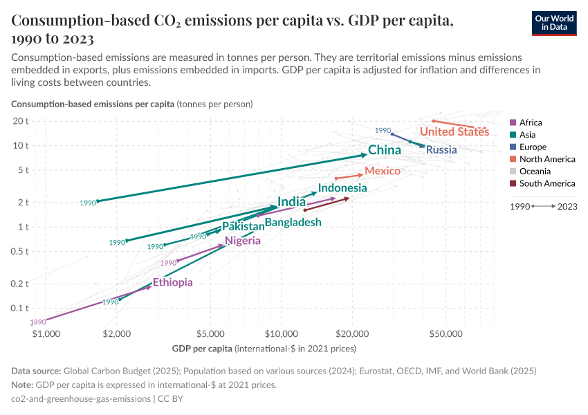On Our World in Data my colleague Hannah Ritchie has looked into a related question and also found that the highest emissions are concentrated among a relatively small share of the global population: High-income countries are home to only 16% of the world population, yet they are responsible for almost half (46%) of the world’s emissions.